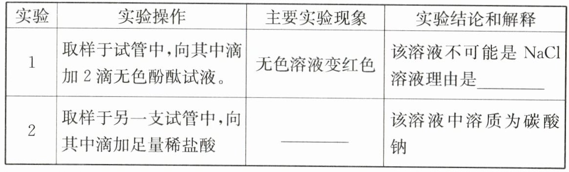 老师指出该结论不严密。理由是:氢氧化钠溶液在空气中敞开放置,发生变质,能产生与实验1和2相同现象。老师提示,不需另取样,只要在实验1后的试管中加入足量CaCl₂溶液,若观察到产生白色沉淀,且溶液______(填现象),即可说明该溶液中有氢氧化钠。