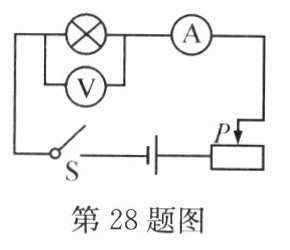 28. (8分)按图示的电路图做“测量小电灯的功率”的实验。所用器材有:标有“3.8 V”字样的待测小电灯、电压恒为6V的电源、标有“20 Ω 1 A”的滑动变阻器、电流表(量程为0~0.6 A、0~3 A)、电压表(量程为0~3 V、0~15 V)、开关及导线若干。