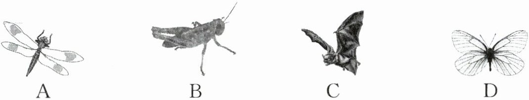 A、B、D都是无脊椎动物,与鸟类亲缘关系较远;蝙蝠是哺乳动物,和鸟类亲缘关系最近。