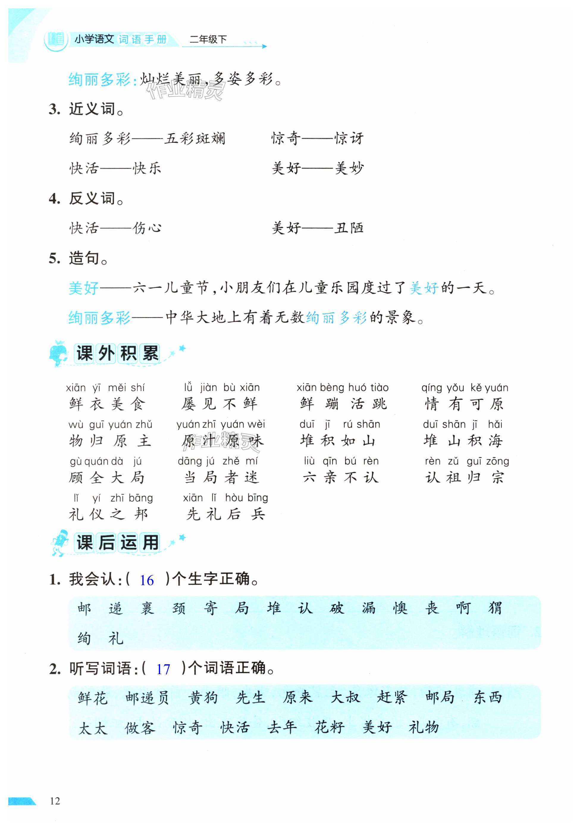 注:目前有些书本章节名称可能整理的还不是很完善,但都是按照顺序排列的,请同学们按照顺序仔细查找。练习册 2025年小学语文词语手册二年级下册人教版开明出版社 答案主要是用来给同学们做完题方便对答案用的,请勿直接抄袭。