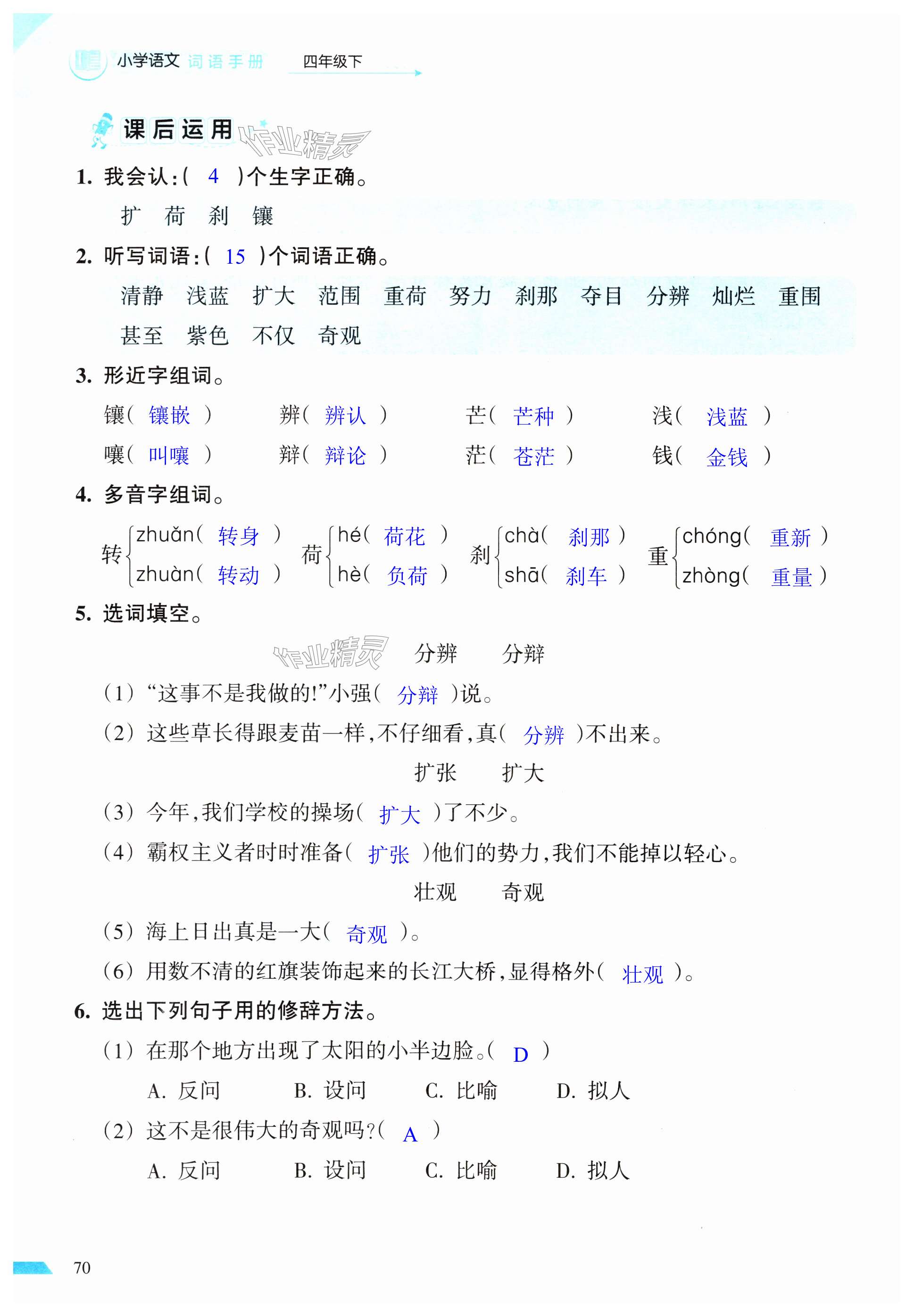 注:目前有些书本章节名称可能整理的还不是很完善,但都是按照顺序排列的,请同学们按照顺序仔细查找。练习册 2025年小学语文词语手册四年级下册人教版开明出版社 答案主要是用来给同学们做完题方便对答案用的,请勿直接抄袭。