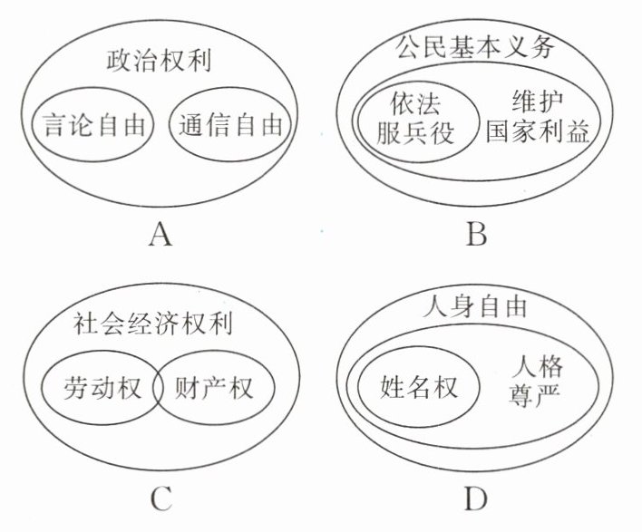 D [本题考查政治常识。通信自由属于人身自由,A项错误。公民的基本义务包括遵守宪法法律、维护国家利益、依法服兵役、依法纳税等,依法服兵役和维护国家利益属于并列关系,B项错误。社会经济权利包括财产权、劳动权、物质帮助权,劳动权与财产权是并列关系,C项错误。人身自由包括人身自由不受侵犯、人格尊严不受侵犯、住宅不受侵犯,通信自由和通信秘密受法律保护;公民的人格尊严包括公民享有的姓名权、肖像权、名誉权、荣誉权、隐私权等,D项正确。]