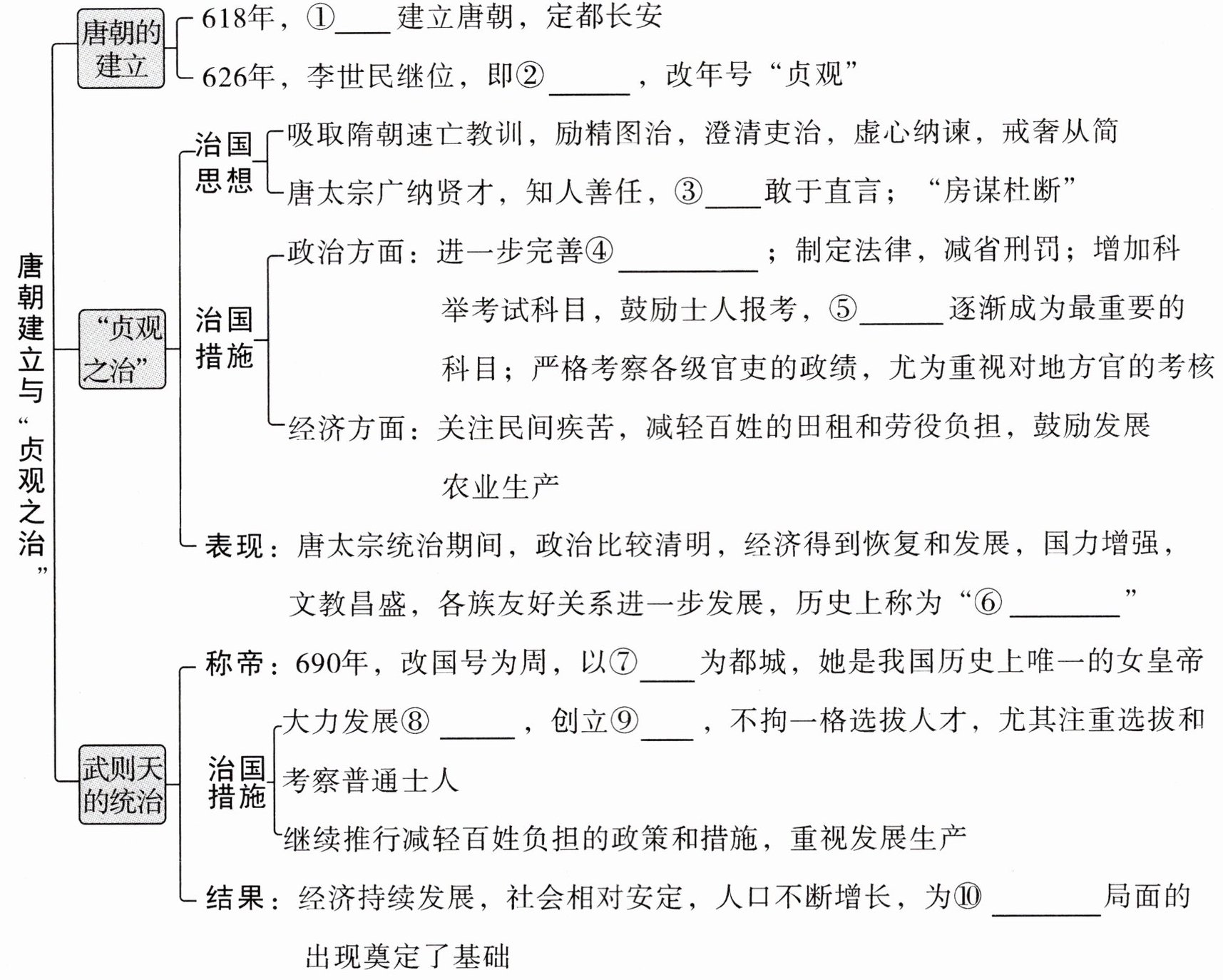 ①李渊 ②唐太宗 ③魏征 ④三省六部制 ⑤进士科 ⑥贞观之治 ⑦洛阳 ⑧科举制 ⑨殿试 ⑩开元盛世