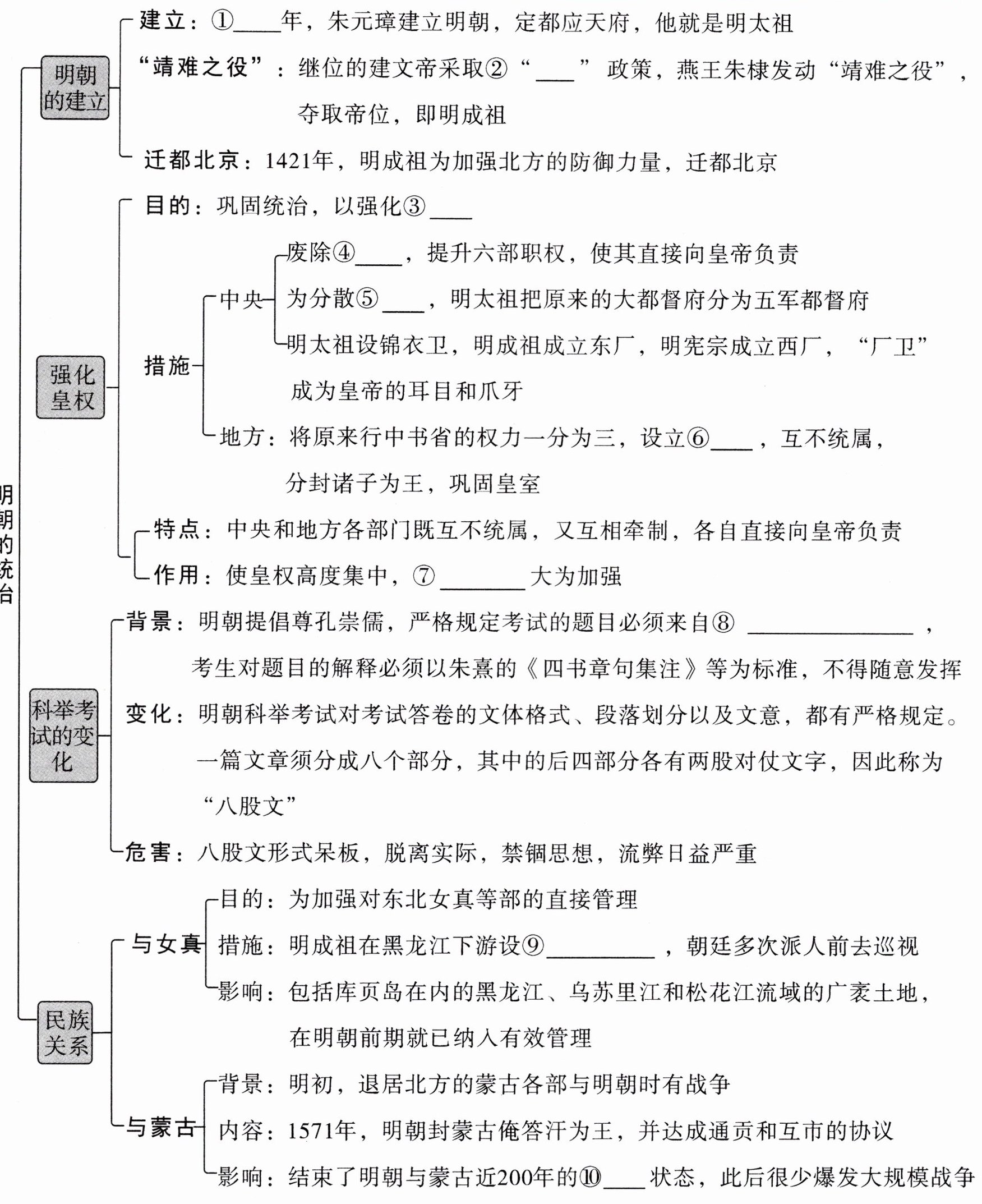 ①1368 ②削藩 ③皇权 ④丞相 ⑤兵权 ⑥三司 ⑦君主专制 ⑧“四五”“五经” ⑨奴儿干都司 ⑩敌对