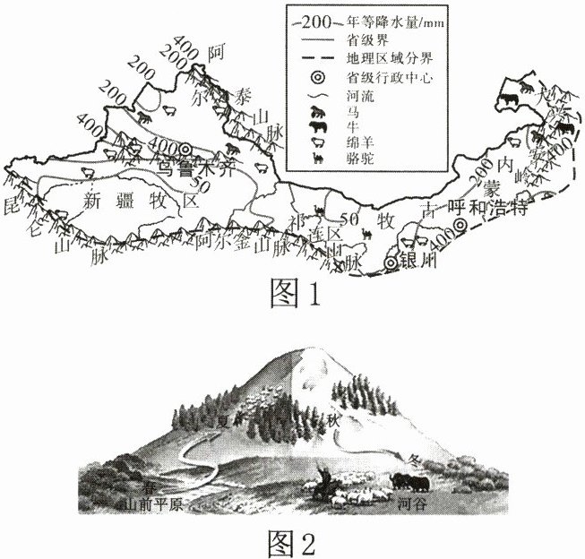 22. 西北地区是我国重要的畜牧业基地。图1为西北地区区域图。读图,回答下列问题。(20分)
