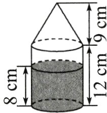 7. 有一个密封的容器中装有一些水(如图),圆柱的高是$12\ cm$,圆锥的高是$9\ cm$,容器内的水面高$8\ cm$。如果将这个容器倒过来,那么水面的高度是$(\ )cm$。
