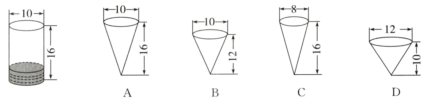 5. 如图,圆柱形容器中的水占圆柱容积的$\frac{1}{4}$,把水倒入圆锥形容器( )中正好倒满。