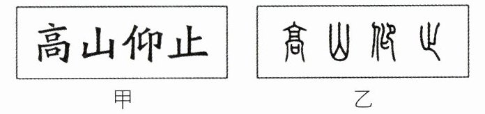 [解析]甲为楷书,字体方正,笔画平直,规矩严整。乙为篆书,笔画复杂,形式奇古,字体优美,颇有古风古韵。据此结合字体特点和词语含义,进行回答即可。开放性题,答案不唯一。