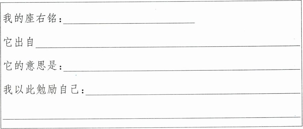 - (2)[示例]我的座右铭:山重水复疑无路,柳暗花明又一村。 它出自陆游的诗——《游山西村》。 它的意思是:山峦重叠、水流曲折,正担心无路可走,柳绿花红间忽然眼前又出现一个山村。 我以此勉励自己:生活中总会有不如意的时候,任何目标的达成都不可能一蹴而就,对任何目标的追求都要坚持不懈,要以乐观的心态去面对人生,逆境的后面往往蕴含着希望和机会。
