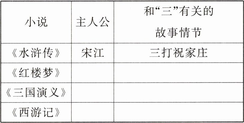 六、中国四大古典名著中巧妙地安排了好多和“三”有关的情节,如武松第三个回合打死了老虎,刘备三顾茅庐请到了诸葛亮。在你读过的这几部小说中还有哪些带“三”的情节呢?照样子填一填。