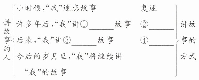 自己的@@集市说书人的方式@@他人的@@文学化的处理@@“我”忘记了母亲分配的活儿,想弥补自己的过失,报答母亲的恩情,也为了向她炫耀“我”的记忆力@@报答母亲的恩情,也为了向她炫耀“我”的记忆力@@批评@@默许@@“我”讲故事的水平不断提高,渐渐赢得了母亲的支持@@“我”在草滩放牧时的所见所想@@孤独寂寞@@这句话把从“我”记忆深处涌出来的故事比作听到集合令的士兵,生动形象地写出了“我”头脑中积累的故事很多,同时也说明这些故事激发了“我”巨大的创作热情与灵感,让“我”文思如泉,笔下生花。