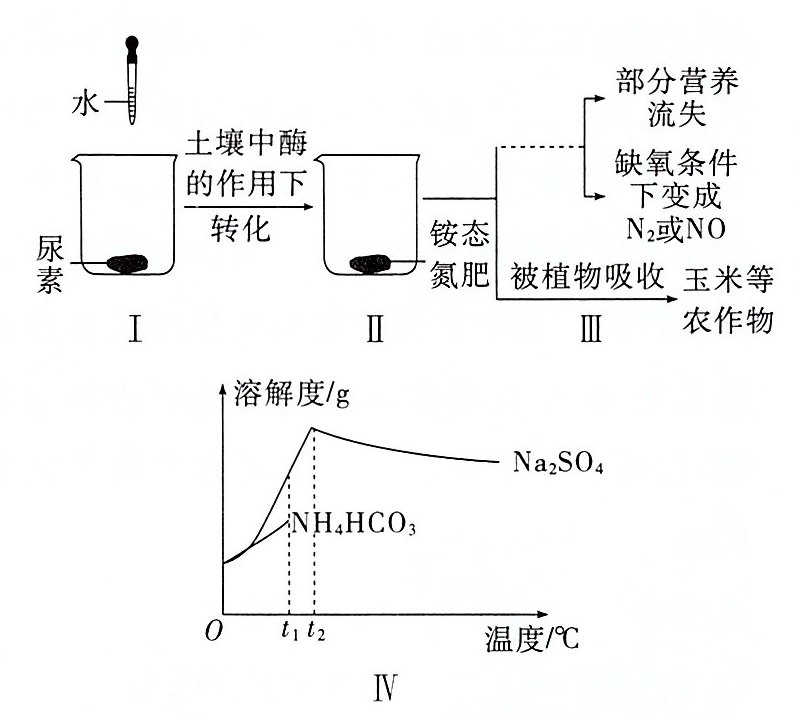 8.尿素$[CO(NH_{2})_{2}]$在农业生产中的使用量较大,它在土壤中的转化和吸收过程模拟如下,土壤中两种物质的溶解度曲线如图Ⅳ。分析如图信息,所得结论正确的是 ( )