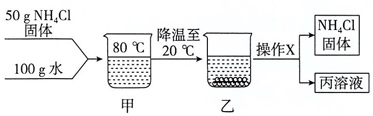 7.(2023德阳)$NH_{4}Cl$是农业生产中的一种肥料。$80^{\circ }C$时,取50 g $NH_{4}Cl$固体放入100 g水中充分溶解,得到的甲溶液按如图所示进行操作。下列分析错误的是 ( )