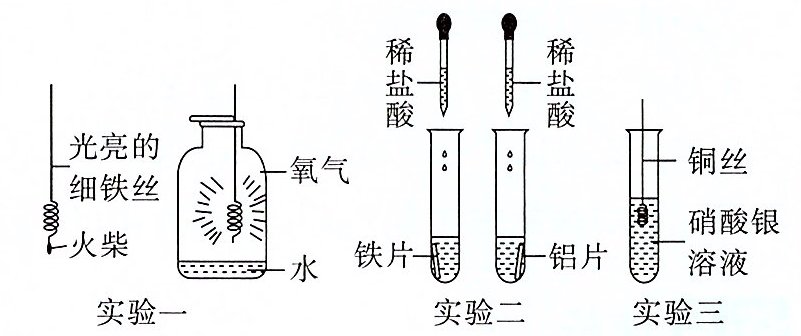 (1)防止生成的高温熔融物溅落,使瓶底炸裂 火柴燃烧消耗了较多的氧气,使氧气浓度不足,不能支持铁丝燃烧 (2)氢气 加入等体积、等浓度的稀盐酸 (3)$Cu + 2AgNO_{3}=2Ag + Cu(NO_{3})_{2}$