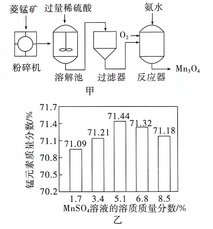 ③70 ℃时,在反应器中保持通入的O<sub>2</sub>和MnSO<sub>4</sub>溶液的质量不变,只改变MnSO<sub>4</sub>溶液的溶质质量分数,测得生成含锰元素的固体中锰元素的质量分数与MnSO<sub>4</sub>溶液的溶质质量分数之间的关系如图乙。由图可知,当MnSO<sub>4</sub>溶液的溶质质量分数为5.1%时,可获得高纯度的Mn<sub>3</sub>O<sub>4</sub>,当MnSO<sub>4</sub>溶液的溶质质量分数为其他数值时,Mn<sub>3</sub>O<sub>4</sub>纯度降低,原因可能是______________________________。