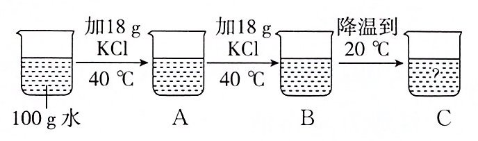 (3)小明同学进行了如图所示的实验,若使烧杯B中的溶液达到饱和,至少需再加入______g KCl;降温至20℃时,烧杯C中会出现的现象是______________________。