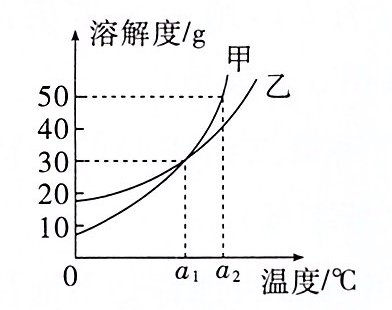A. 在a₁℃时,甲和乙的溶解度均为30 g