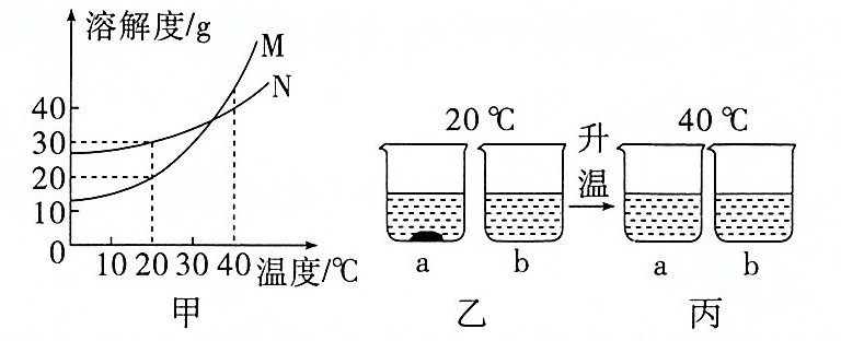 9. 图甲是M、N两种固体的溶解度曲线。20℃时,将等质量的M、N两种固体,分别加入盛有100 g水的烧杯中,充分搅拌后,现象如图乙;升温到40℃时,现象如图丙。下列说法正确的是 ( )