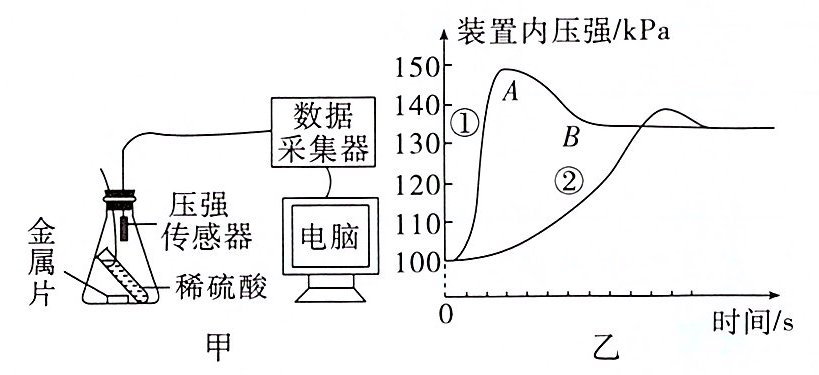 2. 室温下将足量打磨后的镁片、铝片分别与等浓度、等质量的稀硫酸反应(装置如图甲),用压强传感器测得装置内压强随时间的变化关系如图乙。下列说法错误的是 ( )