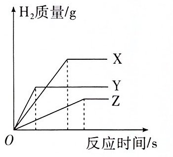 6. 将相同体积、相同浓度的稀盐酸分别加入等质量、颗粒大小相同的X、Y、Z三种较活泼金属中(金属完全反应),生成H₂的质量与反应时间的关系如图所示。下列说法中正确的是 ( )