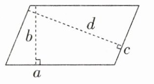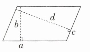 11. 如下图所示,平行四边形$a$边上的高为$b$,$c$边上的高为$d$。根据这些信息,下列式子成立的有( )个。