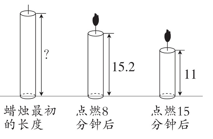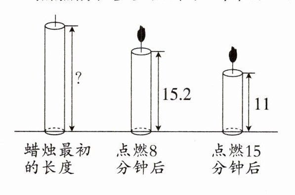 解:设红烛8分钟燃烧了$x$cm。 $(15.2 - 11):(15 - 8)=x:8$ $4.2:7 = x:8$ $x = 4.8$ $15.2 + 4.8 = 20$(cm) 答:红烛在点燃前长20cm。