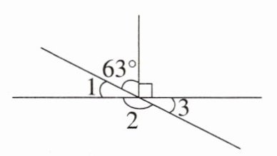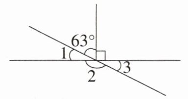 (2)等腰三角形的一个底角是45°,那么它的顶角是(90°),按角分类,它是(直角)三角形。 (3)如下图,∠1 =(27°),∠2 =(153°),∠3 =(27°)。