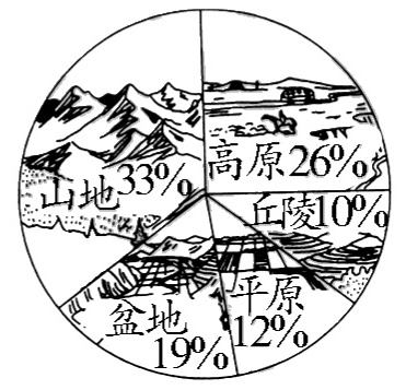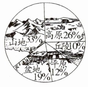 上图是我国地形分布情况统计图,我国陆地面积约960万平方千米,山地面积约(316.8)万平方千米,高原面积比盆地面积约多(67.2)万平方千米。