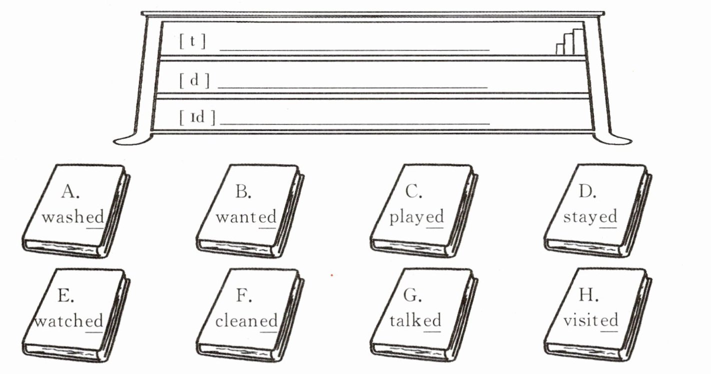 三、放学后,玲玲忙着整理她的书柜。请根据书上单词画线部分的发音,将书本分类摆放,在横线上填入相应的选项。