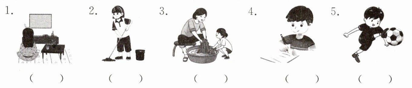 一、一周很快就过去了,同学们的周末是怎么度过的呢?听句子或对话,判断下列图片与你所听到的内容是否相符,相符的画“√”,不相符的画“×”。