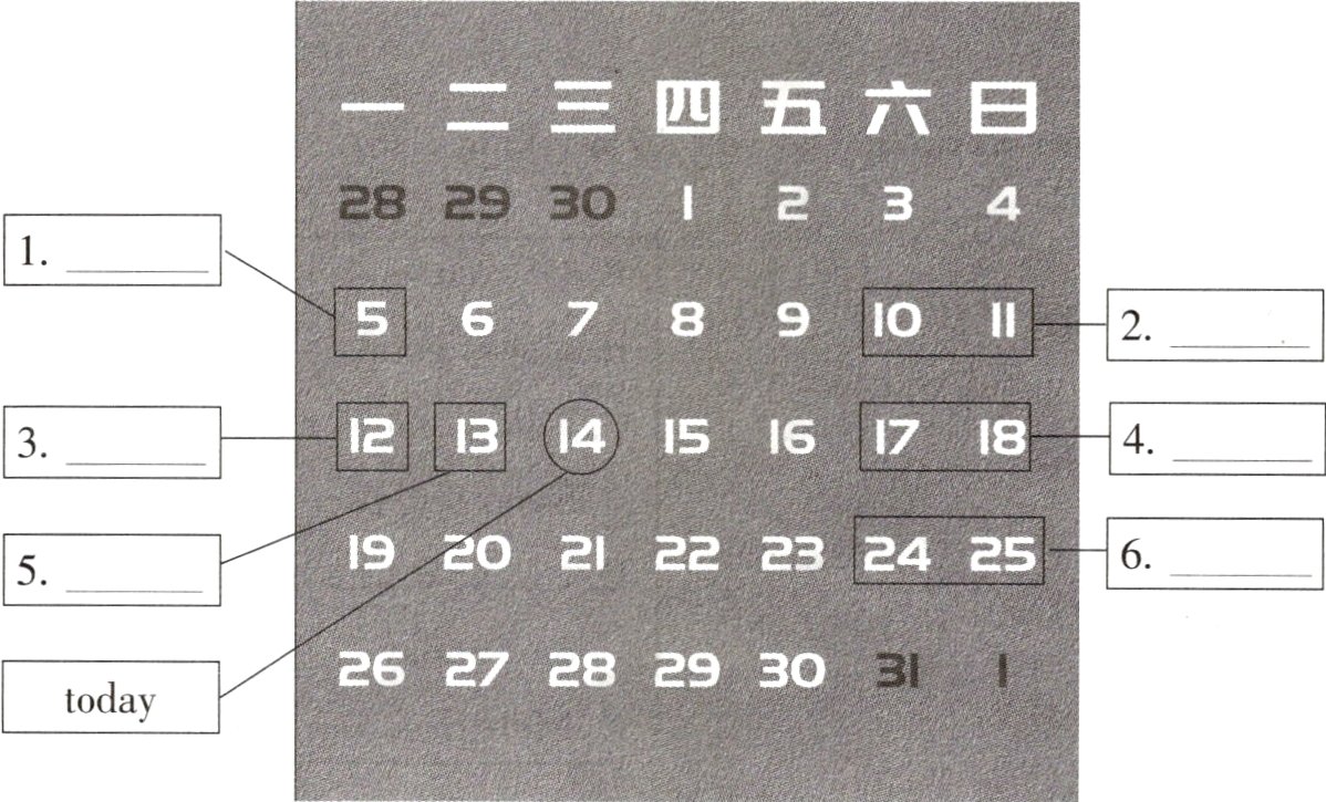 五、Sophia在查看日历。看图,将方框中的时间与日历中的日期相匹配(填选项)。