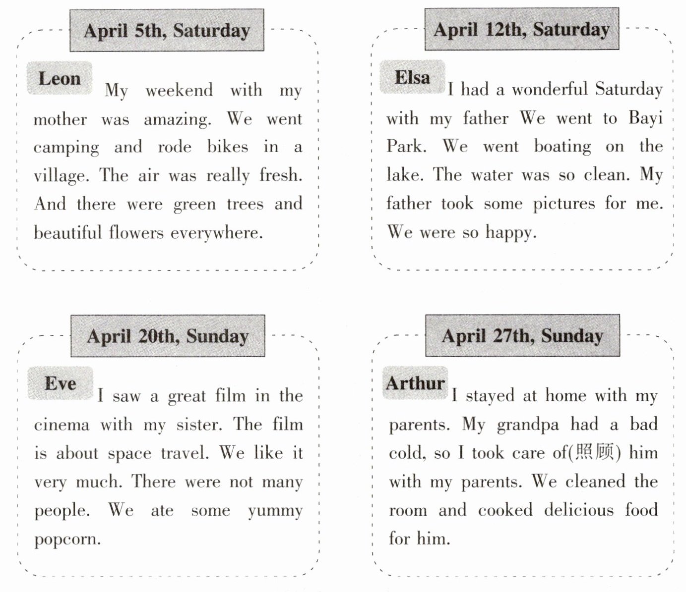 八、Jack班级的板报墙上,描述了大家度过的周末时光。请阅读板报墙上的内容,完成下列任务。