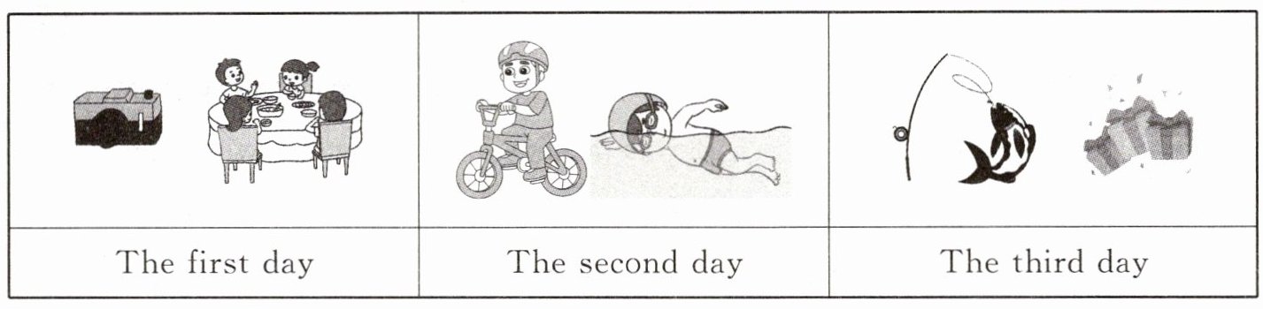 1. took pictures / photos;2. rode bikes;3. went swimming;4. went fishing;5. bought gifts