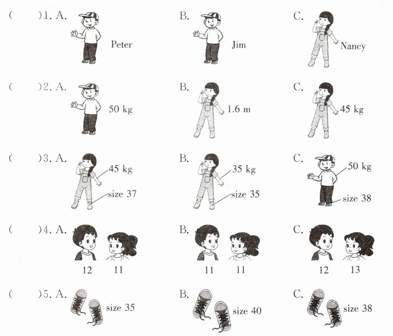 一、同学们要去春游了,他们在填写个人信息卡。听句子或对话,选择与你所听到的内容相符的图片。