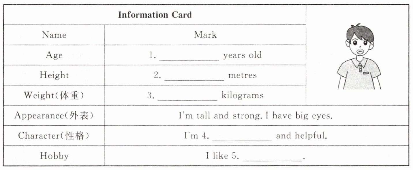 二、Mark不小心把个人信息卡弄脏了。听短文,帮他补全卡片内容。