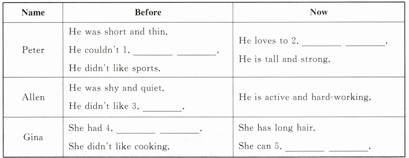 二、南南班级的照片墙上贴满了同学们的老照片,同学们有什么变化?听短文,填写合适的内容完成下面的表格(一空一词)。