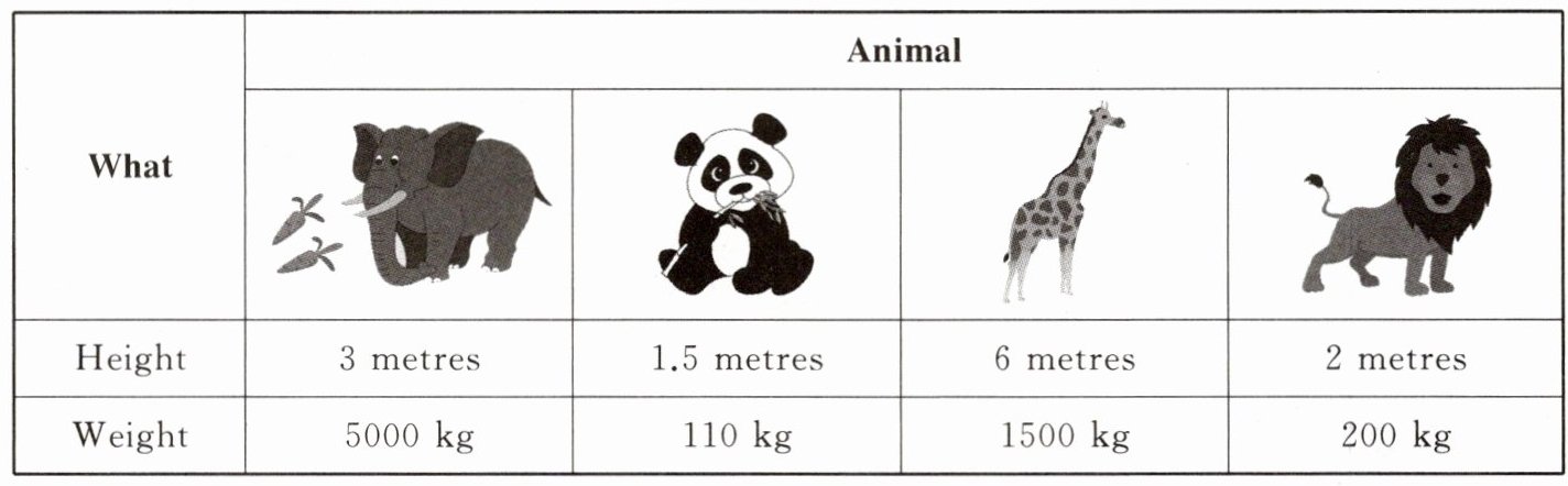 Some animals eat vegetables,grass or leaves,and some animals 1. ________ meat. Look! The elephant is eating carrots. It's so big and tall. It's 2. ________ and 3. ________ than the cute panda. The panda likes to eat bamboo. It has a short tail. And the giraffe likes to eat leaves. It's very 4. ________. Who likes to eat 5. ________? The lion does! It has strong legs. It can run very fast.