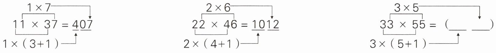 思路点拨:算式中第一个乘数是( )的整数倍,第二个乘数各数位上数字之和是( )。用计算器算出前三题的积,积的规律如下: