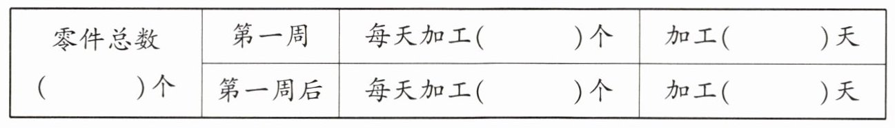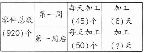 2. 张师傅要加工 920 个零件,第一周加工 6 天,平均每天加工 45 个。之后为了赶进度,决定每天加工 50 个,还需要加工多少天?(先把条件和问题填入下表中,再解答)