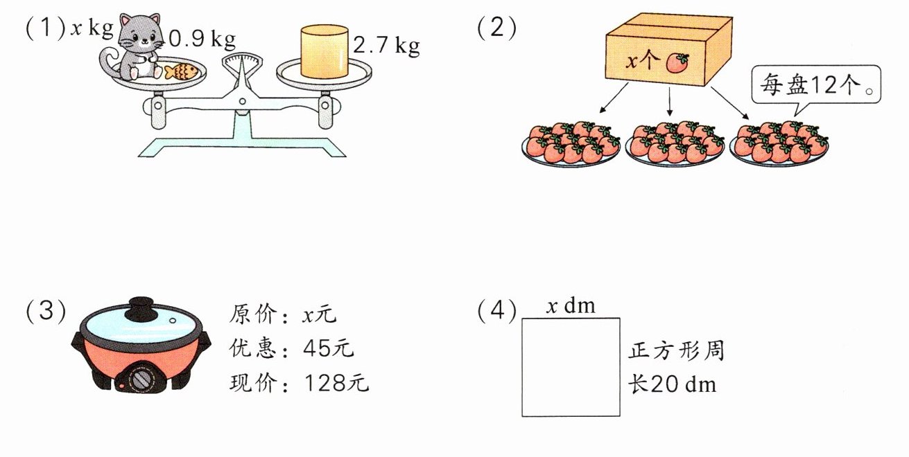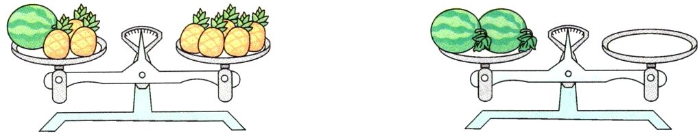 5. 在下面右边天平的空托盘中画出相应个数的菠萝。