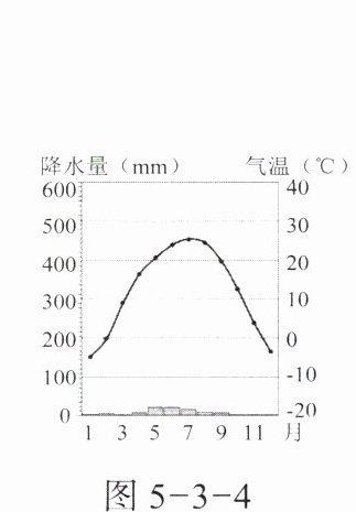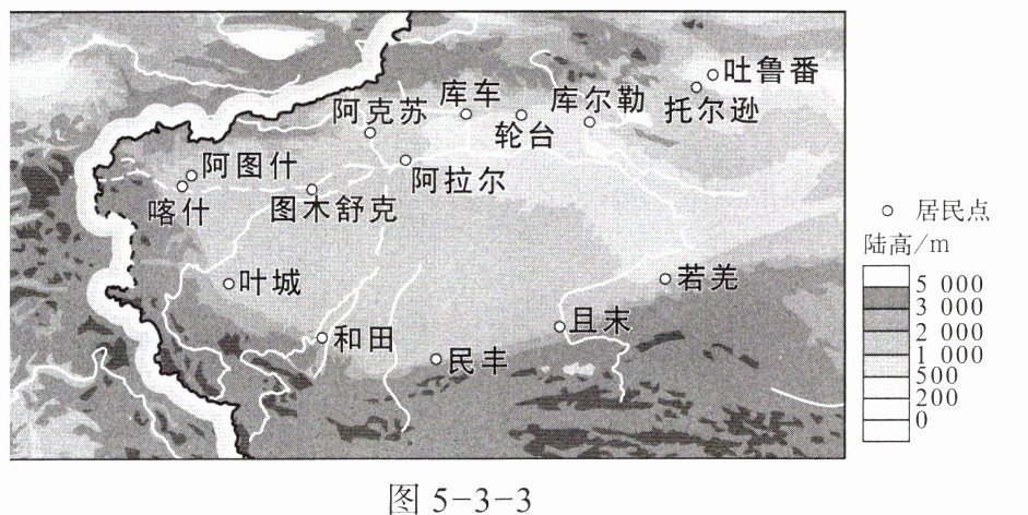 阅读图文材料,回答下列问题。和田地区位于塔里木盆地南部,昼夜温差大,年平均日较差达15℃。图5-3-3为“塔里木盆地居民点分布示意图”,图5-3-4为“和田地区的气温曲线图及降水量柱状图”。