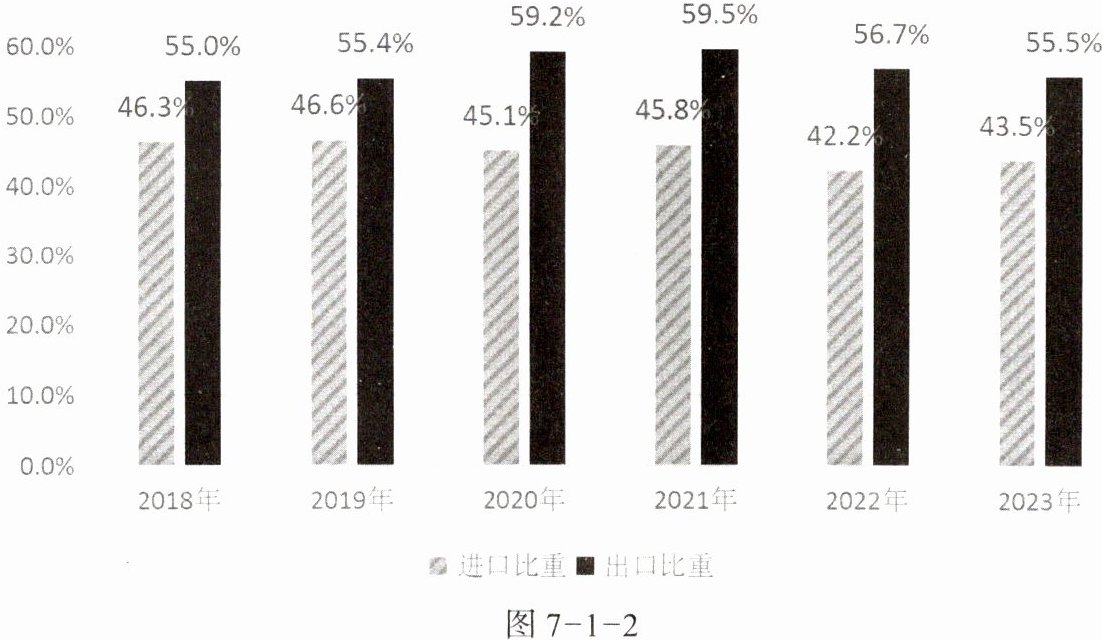 12. 读图7-1-2“祖国内地在香港贸易中所占比重图”,回答下列问题。