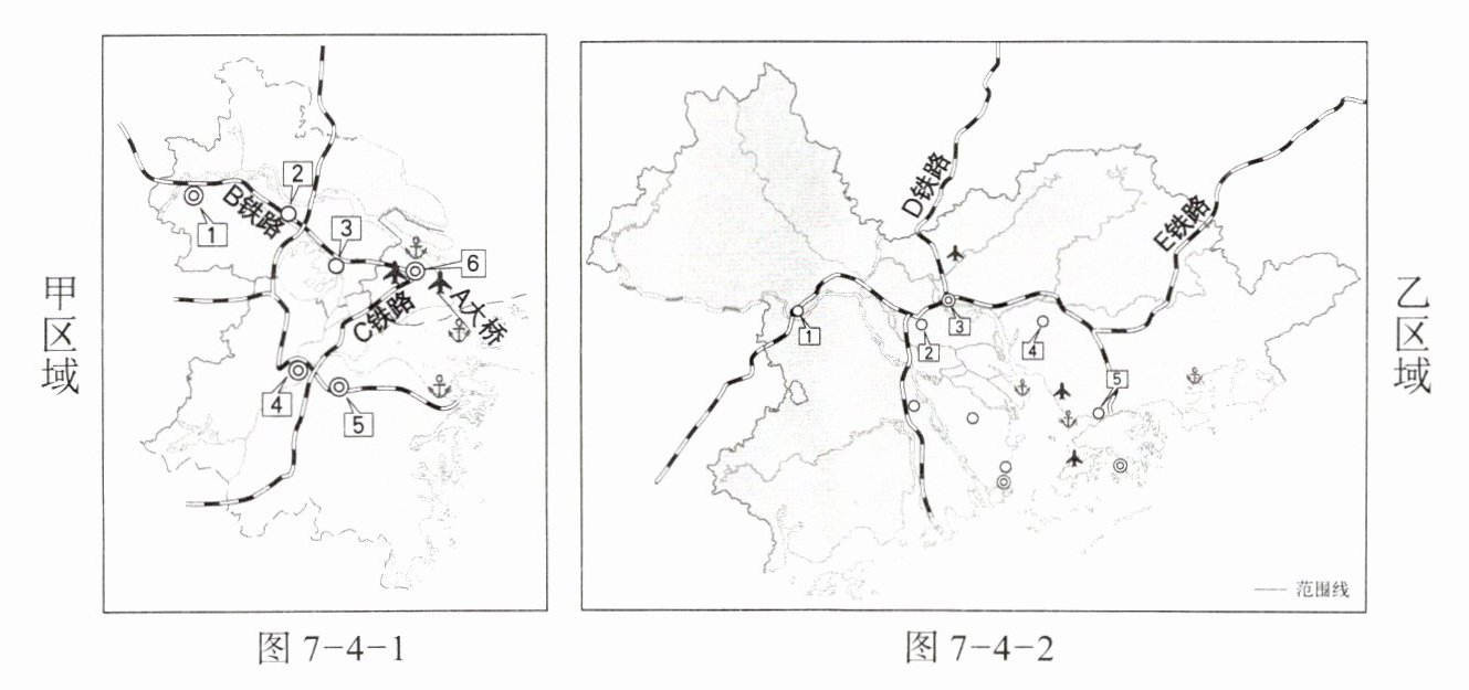 (6)经过乙区域的重要铁路线有D_________和E_________。两条铁路最终都能到达_________(填城市)。