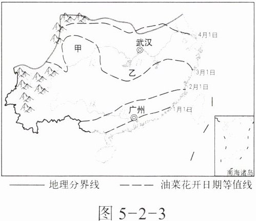 油菜是我国南方地区的主要油料作物。图5-2-3为“油菜花开日期等值线图”,线端数字表示该线经过地区的油菜花开日期。