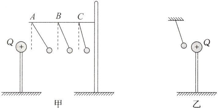 14 学习了电荷间的相互作用之后,小沈同学大胆地猜想,电荷间相互作用力的大小是否与两电荷所带的电荷量和它们之间的距离有关呢?于是他用如图甲所示装置做起了实验,Q是一个带正电的物体,把系在丝线上的带正电的小球先后挂在A、B、C三处,比较小球在不同位置所受带电物体的作用力的大小。回答下列问题: