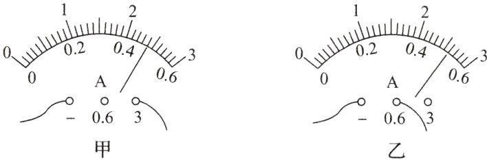 6(2024·宜春期中)如图是实验室常用的一种电流表,其零刻度不在表盘的最左端。当导线a、b分别与标有“-”和“3”的接线柱相连时,电流表指针偏转情况如甲图所示。