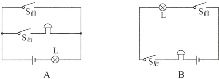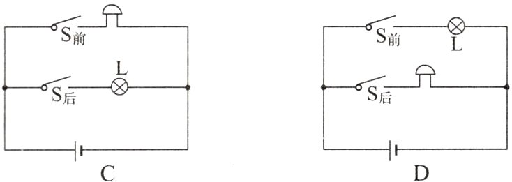 6(2023·扬州中考)物流仓库值班室,当前门来人时灯亮,后门来人时电铃响。下列电路设计符合要求的是 ( )