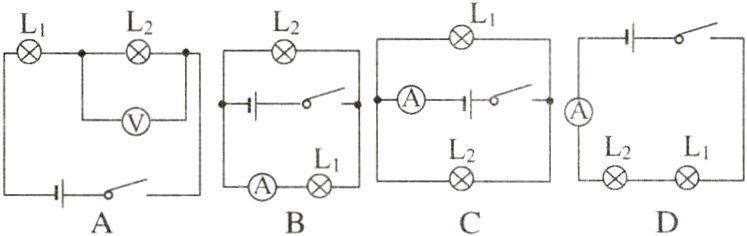 D 电路中使用的是电压表,不能测量出通过灯泡$L_{2}$电流,故 A 错误;闭合开关后,该电路为并联电路,电流表与$L_{1}$串联在支路中,能直接测量$L_{1}$的电流,故 B 错误;闭合开关后,该电路为并联电路,电流表接在干路中,测量的是总电流,无法直接测量$L_{2}$的电流,故 C 错误;闭合开关后,该电路为串联电路,电流表能测量通过$L_{2}$的电流,故 D 正确。