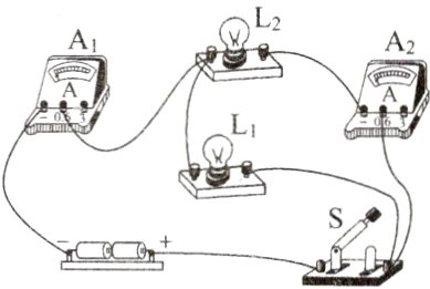 【解析】由实物图可知,两灯泡并联,电流表$A_{1}$测干路的电流,电流表$A_{2}$测灯$L_{2}$的电流;闭合开关后,电流表$A_{1}$、$A_{2}$的示数分别为$0.5\ A$和$0.3\ A$,即$I = 0.5\ A$,$I_{2}=0.3\ A$,由并联电路的特点可知,流过小灯泡$L_{1}$的电流为:$I_{1}=I - I_{2}=0.5\ A - 0.3\ A = 0.2\ A$。