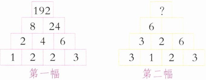 5. 同学们玩“建宝塔”的数学游戏。下面第一幅图是天天建的宝塔,第二幅图是聪聪按照同样的规律建的宝塔。聪聪建的宝塔的顶层上的数是多少?